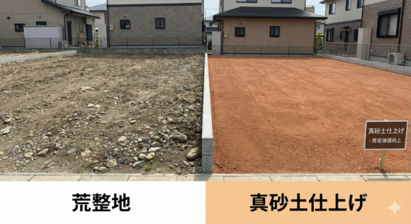 | 真砂土・山砂仕上げ | 荒整地後、表面に良質な真砂土や山砂を敷き詰めて丁寧に仕上げる。見栄えが良い。 | 土地売却(仲介業者経由)、月極駐車場(舗装前)、家庭菜園 |
