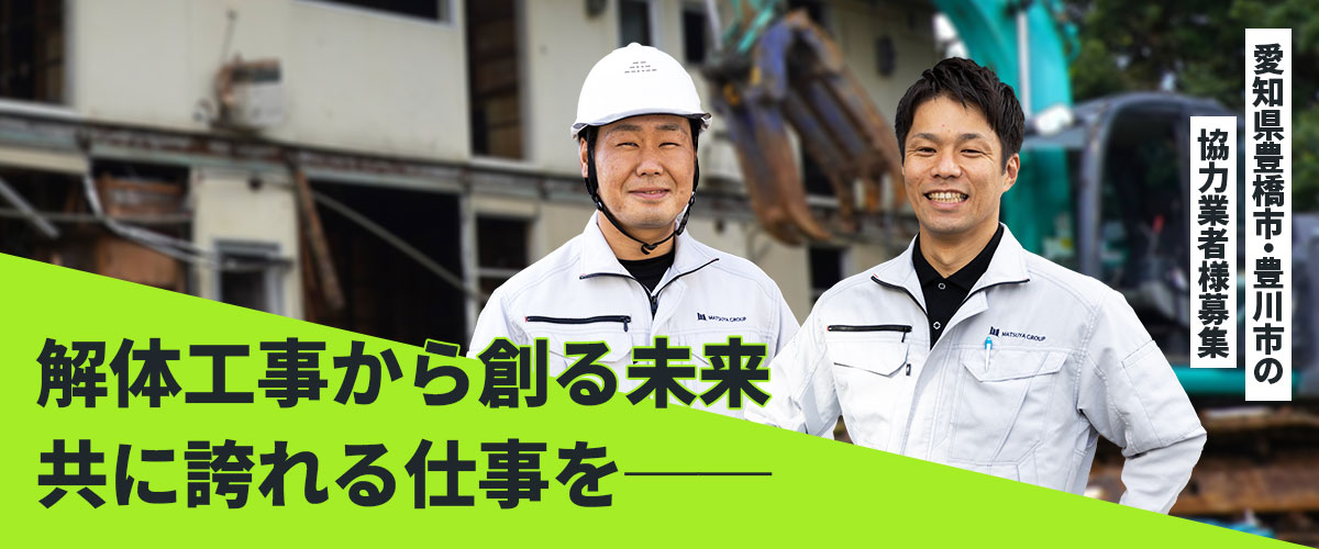 レックス解体では、豊橋市・豊川市を中心に解体業を行っております。事業急成長に伴い協力業者様を募集させていただきます。
